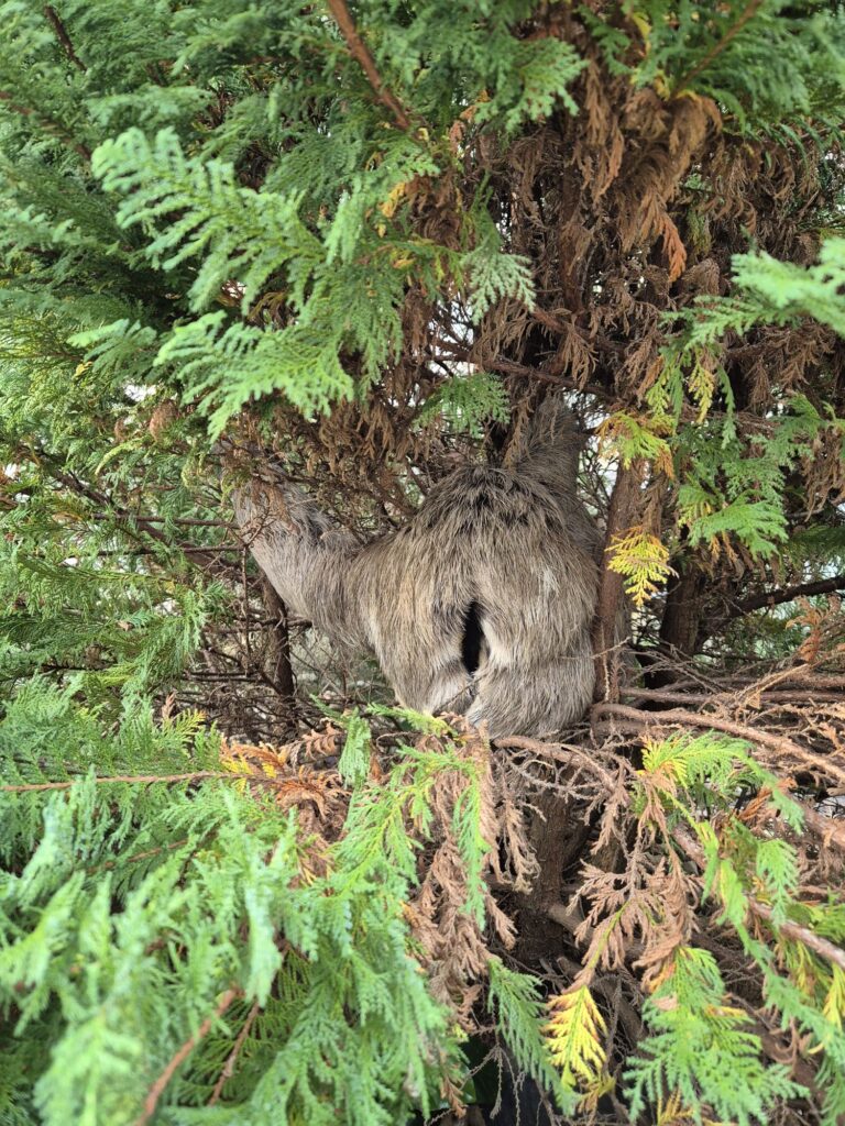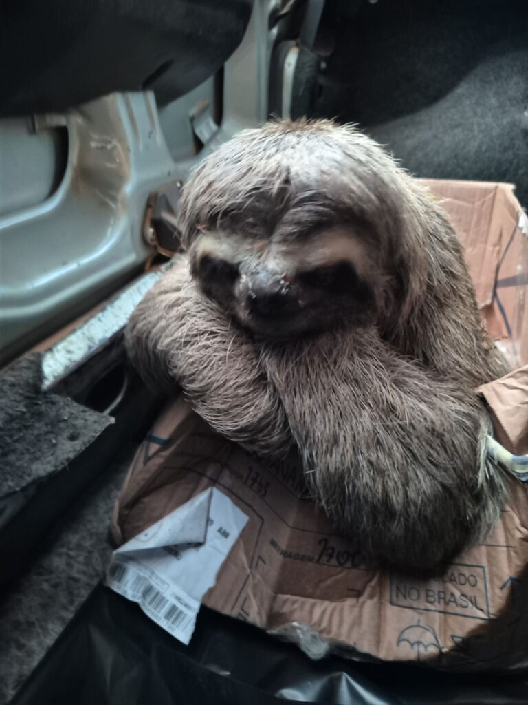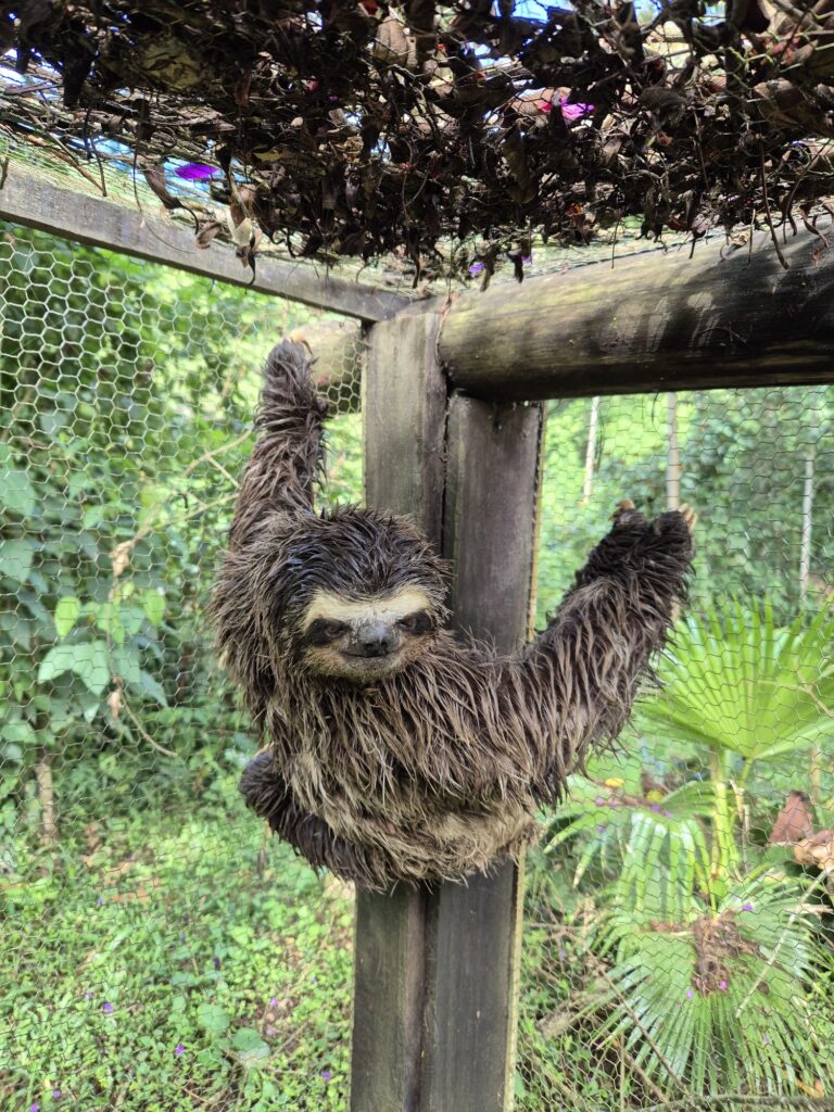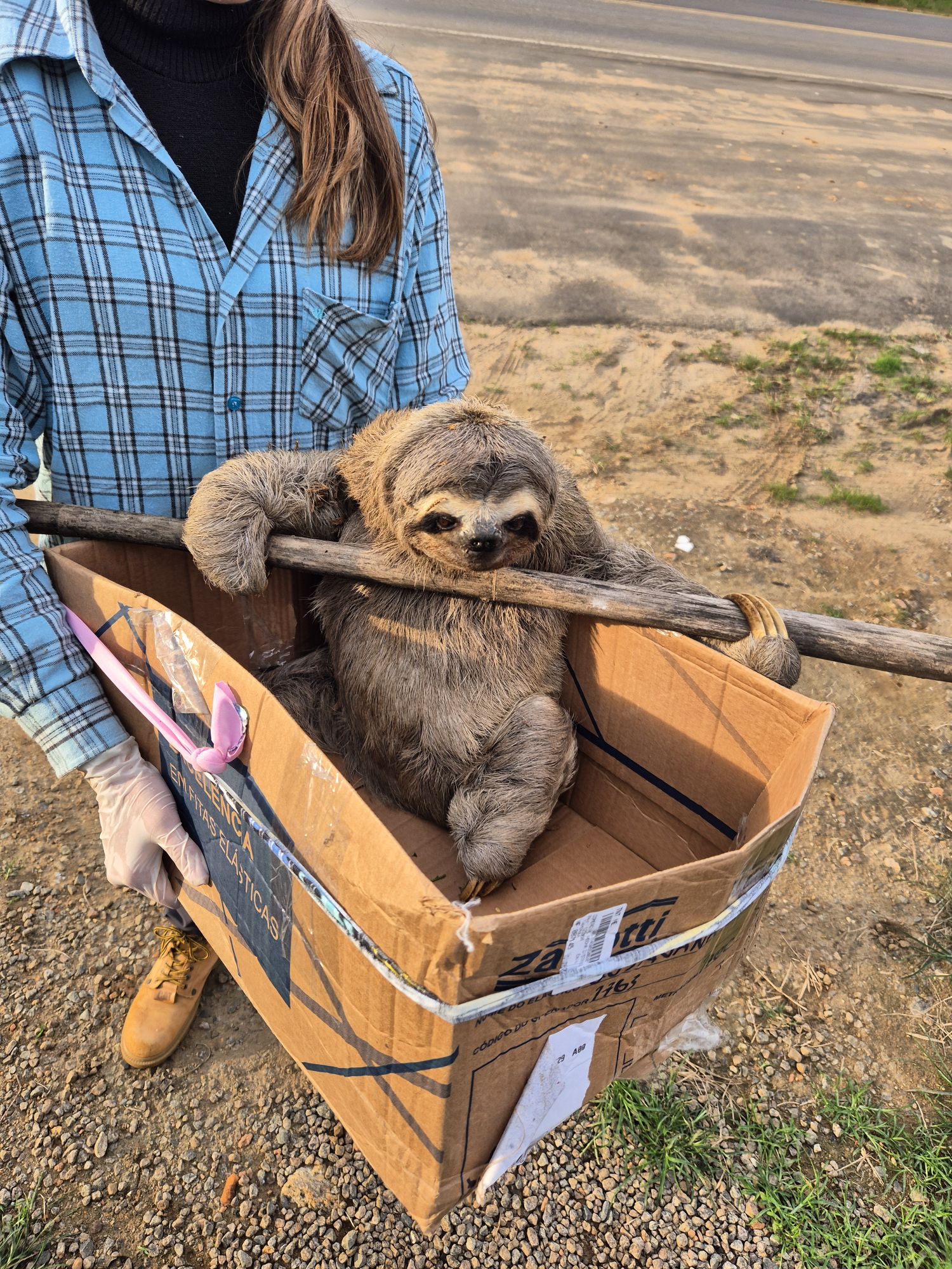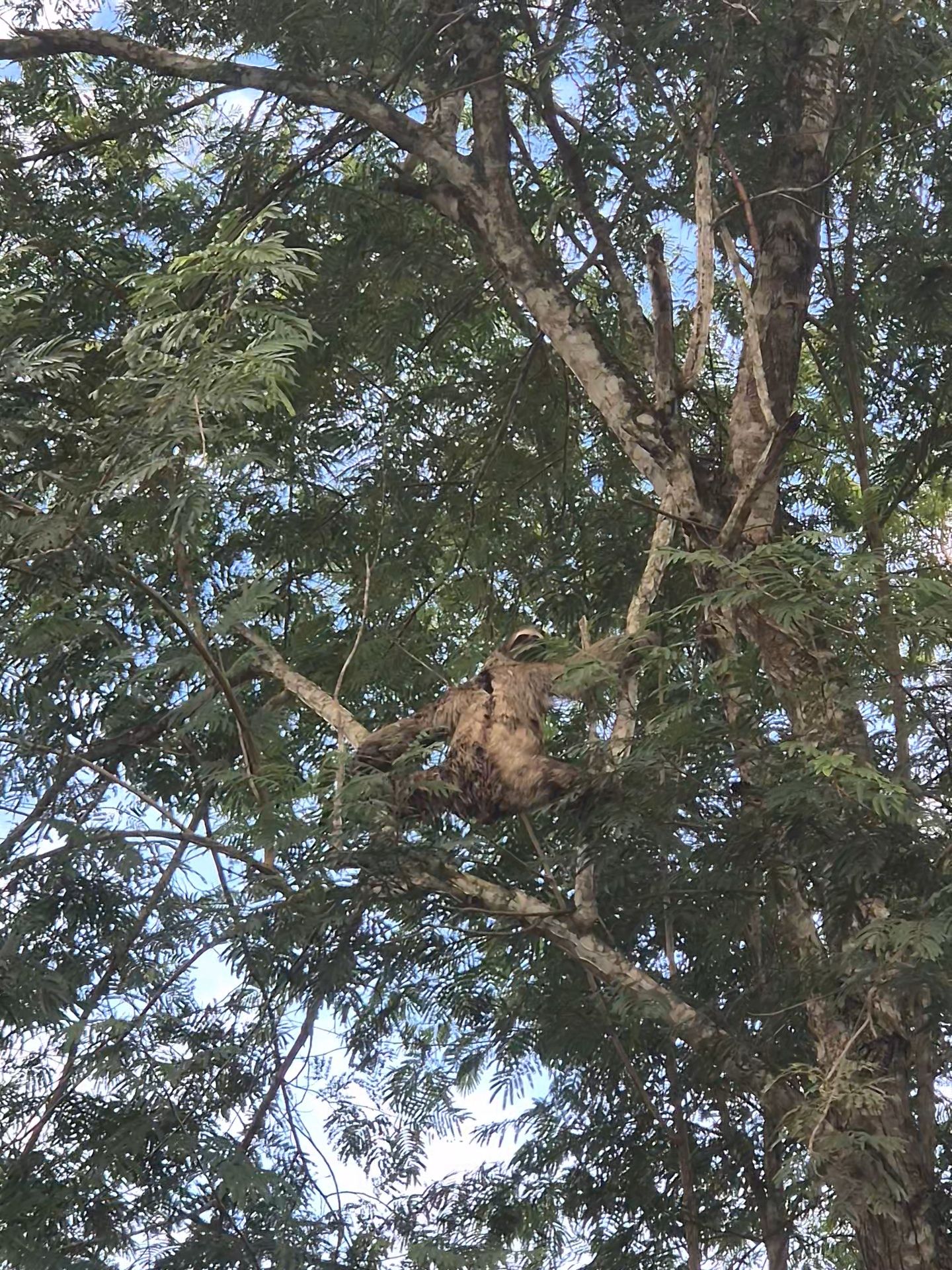 Inzwischen fällt uns der Übergang zwischen Urlaub und Arbeit recht einfach, da sind wir ja inzwischen recht geübt ;). Dementsprechend haben wir dann auch wieder gut in den Alltag gefunden, während Isabel noch mit ihrer Mutter zusammen unterwegs war. Allerdings kam dann etwas auf uns zu, das auf keinen Fall zum Alltag gehört. Immer wieder werden um Iracambi herum Faultiere gefunden, die auf der Straße liegen und etwas Hilfe brauchen. Manche müssen nur wieder an den Straßenrand oder in einen Baum gesetzt werden, aber andere sind verletzt und brauchen die Hilfe von einem Tierarzt. Allerdings ist das seltsamerweise immer vorgekomen, wenn ich unterwegs war oder noch bevor ich überhaupt in Brasilien angekommen bin. Deshalb habe ich bisher noch kein einziges Faultier gesehen :(. Allerdings sollte sich das ändern, denn eine Schülerin hat bei Iracambi angerufen, da sie in ihrem Vorgarten an einer stark und schnell befahrenen Straße ein Faultier gefunden hat, welches leicht im Gesicht verletzt wurde. Daraufhin haben wir uns mit dem Auto auf den Weg gemacht, dem Faultier zu helfen. Angekommen haben wir die vermutete Faultierdame in einem Nadelbaum an der Straße gefunden, dort hat sie es sich sehr gemütlich gemacht. Allerdings war es dort für sie nicht sicher, da statt Wald nur Straße und Häuser in der Nähe waren. Aus dem Grund, dass sie noch im Gesicht verletzt war, haben wir uns entschieden, sie mit nach Iracambi zu nehmen und einen Tierarzt zu rufen, der dort einen Blick auf sie werfen kann.