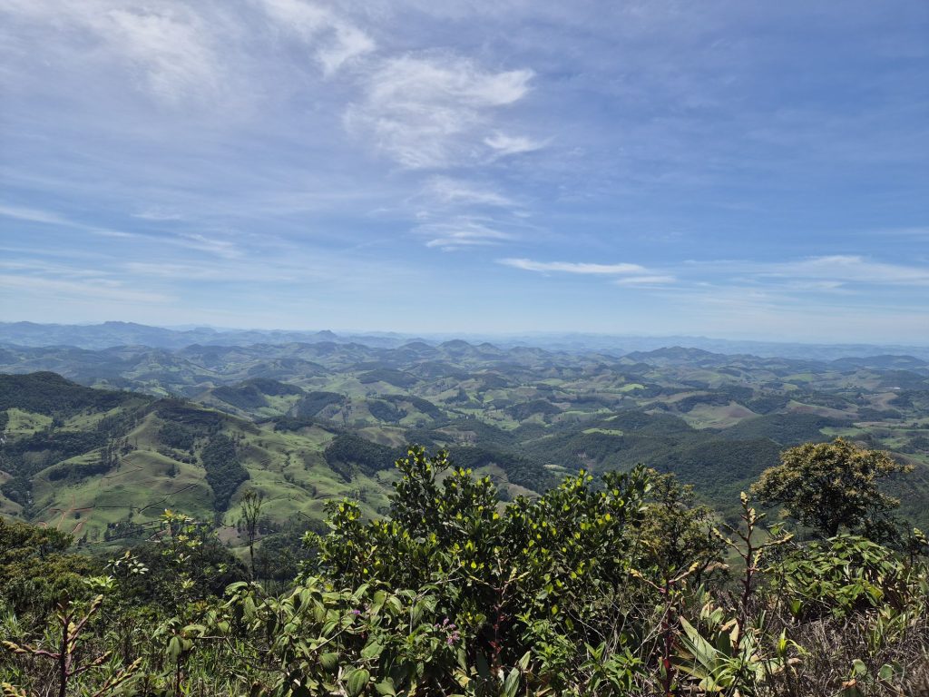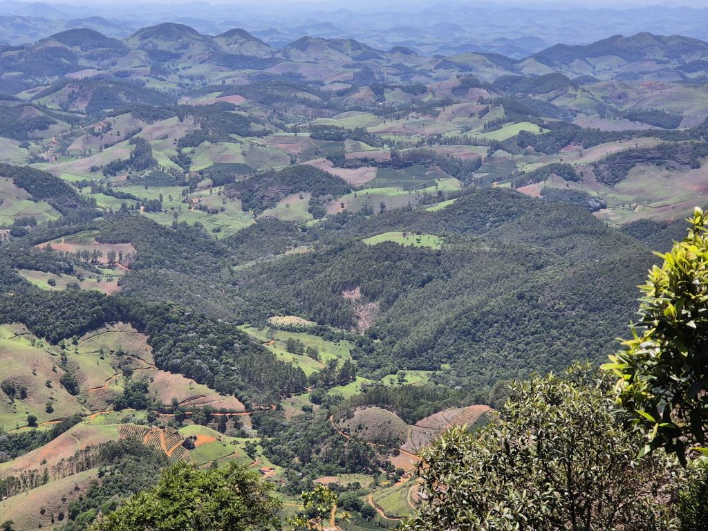 Auch wenn ihr auf meinen tollen Bildern immer tollen Regenwald seht, heißt das nicht, dass wir nichts zu tun haben, denn im gesamten Gebiet des ursprünglichen Regenwaldes von 1,2-1,3 Millionen km² (!) sind heute nur noch ~ 100 Tausend km² erhalten. Diese sind meist nur in kleinen separierten Flecken von Wald erhalten, was eine ausgeprägte Artenvielfalt und ein balanciertes Ökosystem behindert. Die meiste Fläche dazwischen ist Landwirtschaft, hier in Minas Gerais vor allem Kuhhaktung und Kaffeeanbau. Wie das aussieht, sieht man auf diesen Bildern ganz gut.