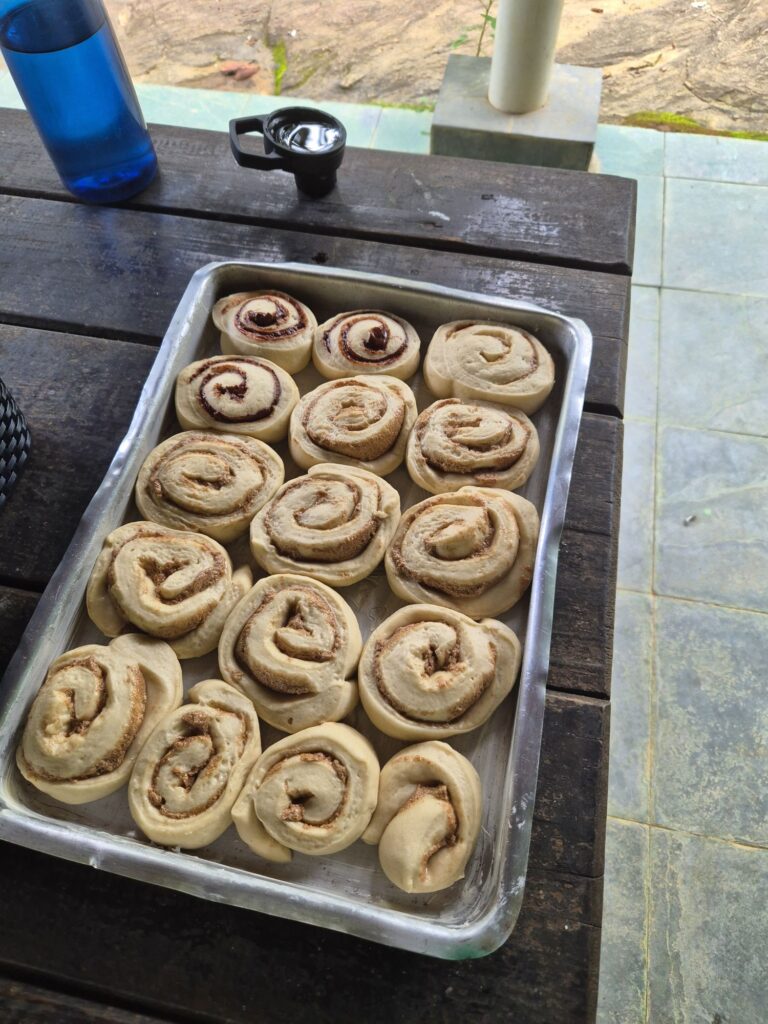 Auch wenn das sehr abwechslungsreich klingt, ist es tatsächlich so, dass man das Essen schnell satt hat. Obwohl alles wirklich sehr lecker ist, wiederholen sich abgesehen vom Reis und den Bohnen alle Sachen spätestens nach 3-4 Tagen. Deshalb hat man doch das Gefühl immer das Gleiche zu essen. Deshalb machen wir ab und zu selber etwas anderes. Manchmal macht Isabel Brot fürs Frühstück oder Pizza am Wochenende und manchmal mache ich vegane Zimtschnecken.
