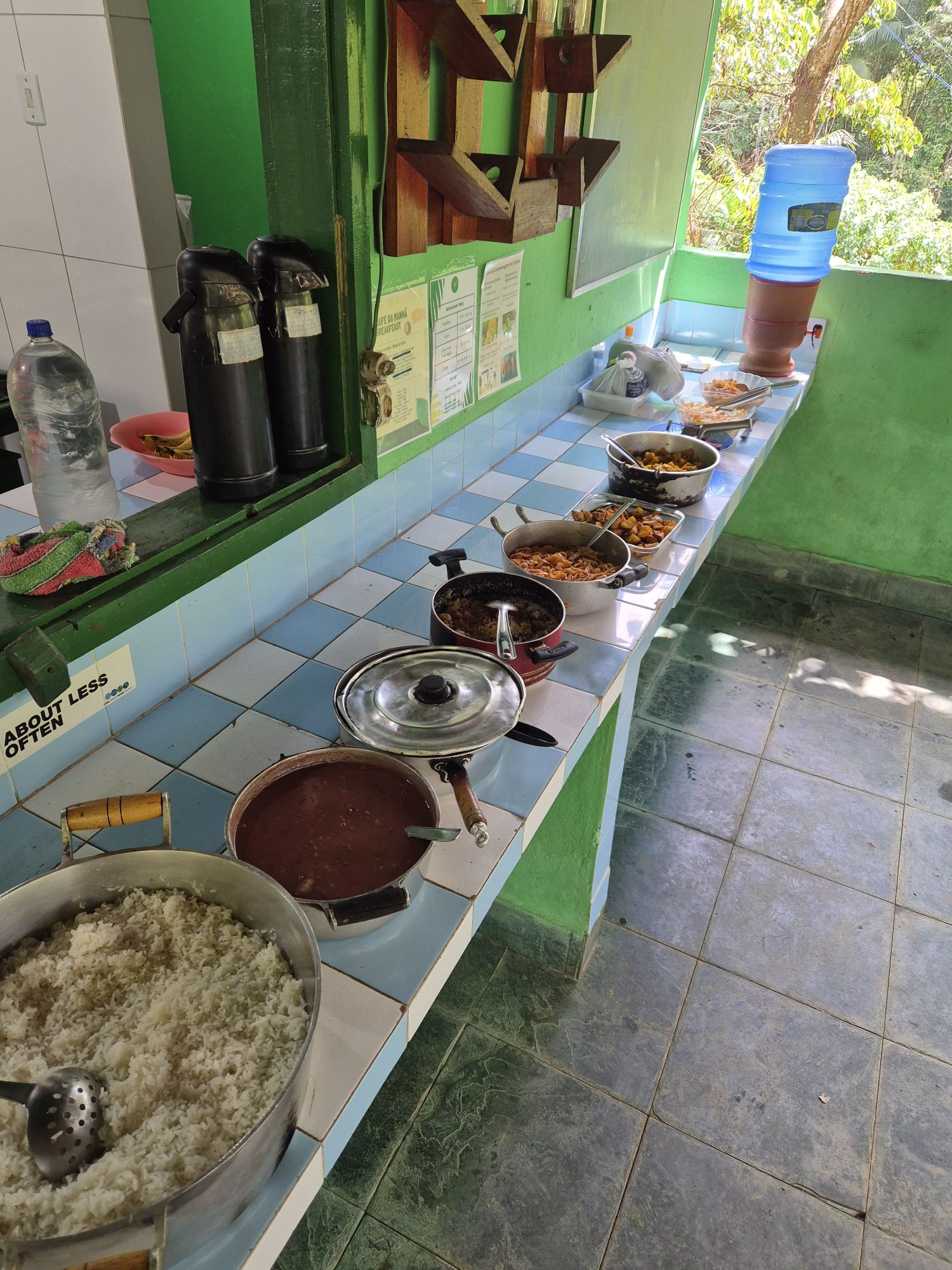 Die ersten zwei Töpfe sind, wie man der Größe nach urteilen kann, die wichtigsten, denn Reis und Bohnen gibt es jeden Tag zum Mittag- und Abendessen. Dazu gibt es noch verschiedenste Gerichte, die man sich dazu mit auf den Teller nimmt. Im Prinzip werden immer mehrere Gerichte zubereitet, die man dann zusammen auf einem Teller ist. An diesem Tag gibt es neben Reis und Bohnen ein Fleischgericht, Hackfleisch mit Gemüse, Nudeln mit Tomatensoße, gebackene Süßkartoffeln, Kürbis, Krautsalat und Kichererbsensalat. Es gibt mal mehr mal weniger Auswahl aber allgemein ist das Prinzip nicht wie in Deutschland, dass man eine Sache zubereitet, die für sich steht, sondern, dass man von allem etwas ist. Besonders Kohlenhydrate kommen bei Reis, Bohnen, Nudeln, Kartoffeln und häufig Maniok nie zu kurz.