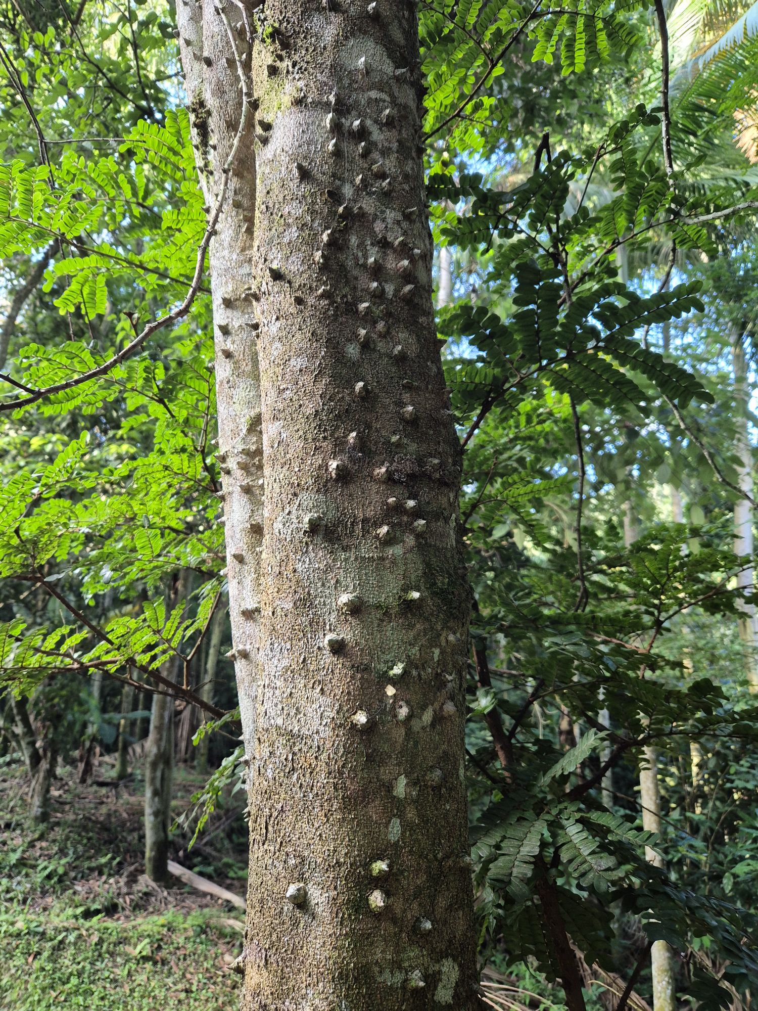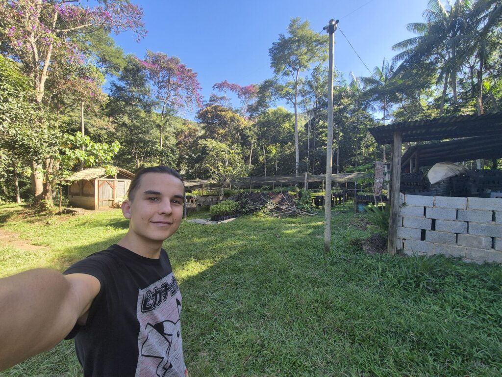 Des Weiteren ist der Baum in der IUCN Liste der gefährdeten Arten als „stark gefährdet“ eingestuft, da fast der gesamte Bestand, für die Nutzung des Farbstoffs im Holz, gefällt und nach Europa verschifft wurde. Das ist der vorletzte Stufe vorm Aussterben. Nachdem er vor einigen Jahren hier gepflanzt wurde, kommt der Baum auch bei uns in Iracambi vor, obwohl er eigentlich nicht in Minas Gerais vorkommt. Die Bilder habe ich 10m neben meiner Schlafhütte gemacht.
