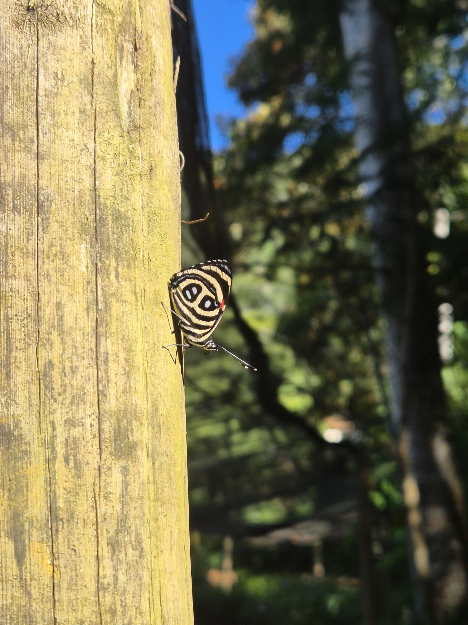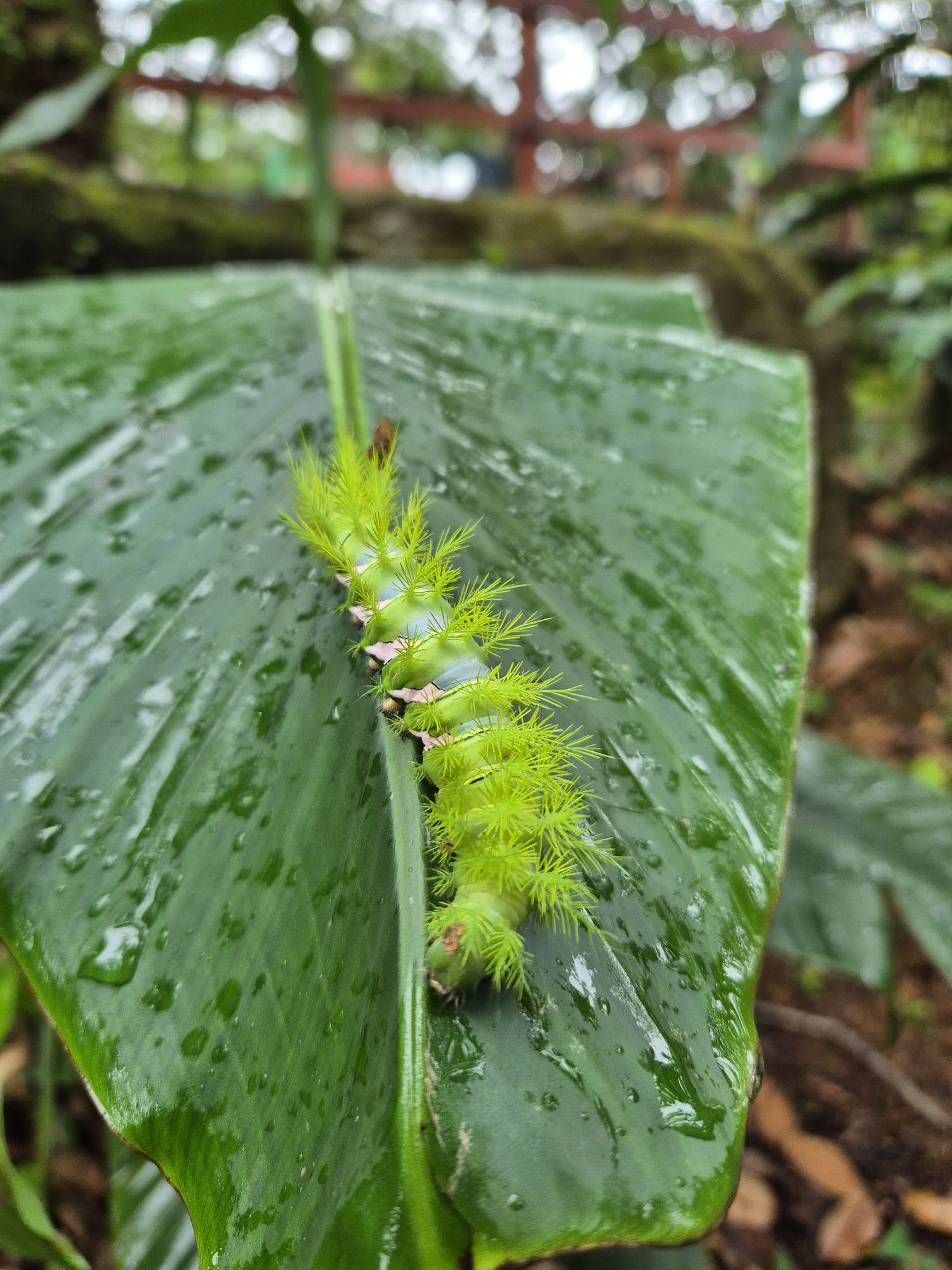 Während der Arbeit in der Agroforestry haben wir ein kleines Kolibrinest im Kaffee gefunden. Diese Pflanze und das Nest haben wir dann in Ruhe gelassen. Außerdem habe ich in Iracambi noch zwei sehr schöne Tiere gefunden. Einmal hier diese verrückte Raupe, die aussieht als wären Korallen auf ihr gewachsen. Sie wird wohl später zu einer Motte werden. Der Schmetterling daneben heißt auf portugiesisch „oito-oito“ also „acht-acht“, weil das Muster so aussieht. Es gibt verschiedene Spezies die dieses Muster haben, die schönsten haben sogar noch eine ganze Menge rot außen auf den Flügeln und von innen sind sie schwarz mit einem türkisblauen Streifen. Meiner Meinung nach sind das die schönsten Schmetterlinge, die hier rumfliegen.