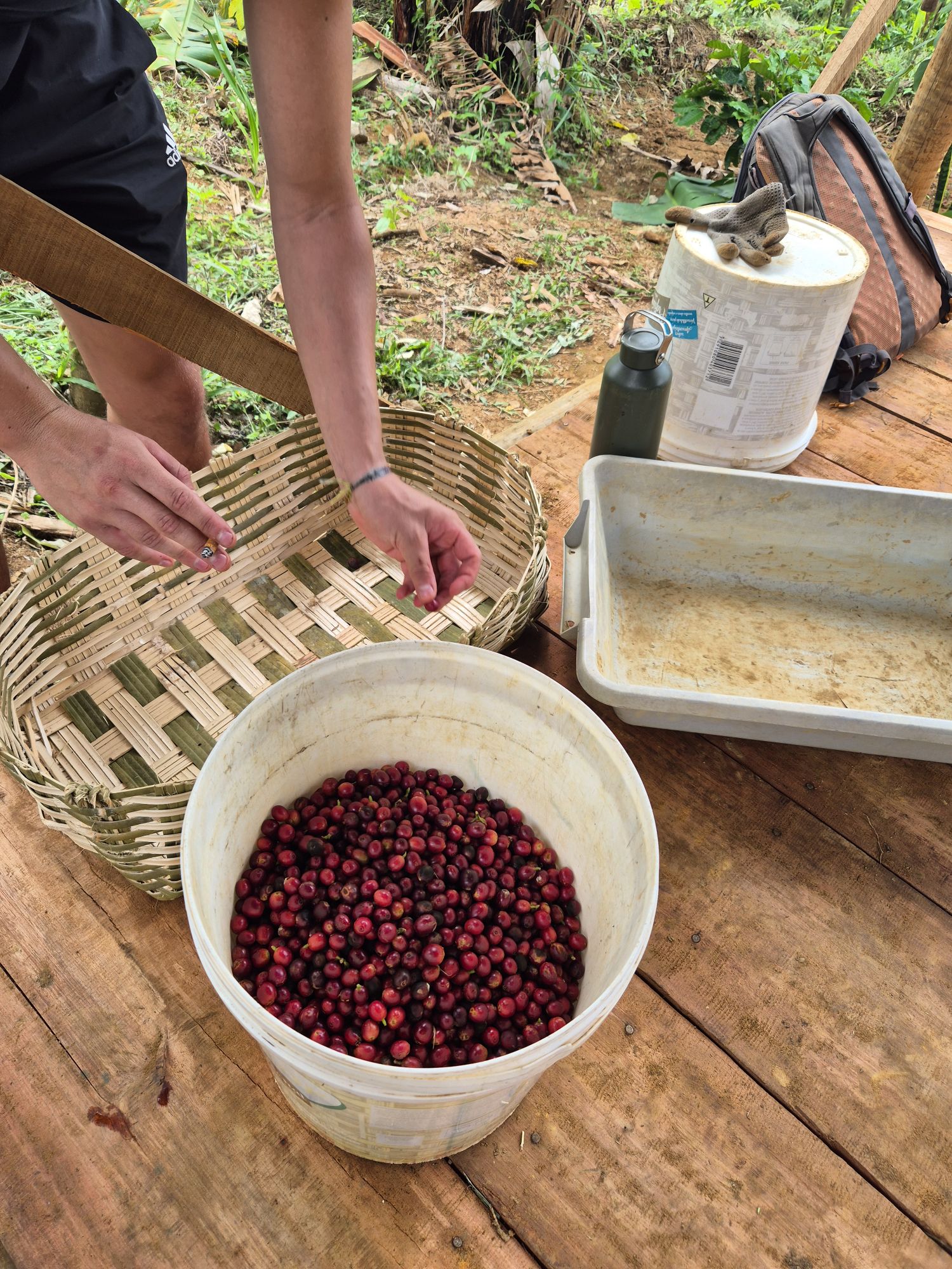 Wie du vielleicht merkst, ist es ein enormer Aufwand, den Kaffee so von Hand zu pflücken. Aus diesem Grund machen die meisten Kaffeebauern das mit maschineller Unterstützung. In diesem Fall werden aber auch unreife Kaffeekirschen mitgeerntet, was zu einer schlechteren Qualität führt. Da Pierre versucht, die bestmögliche Qualität zu erreichen, hat er sich für diese Art der Ernte entschieden.