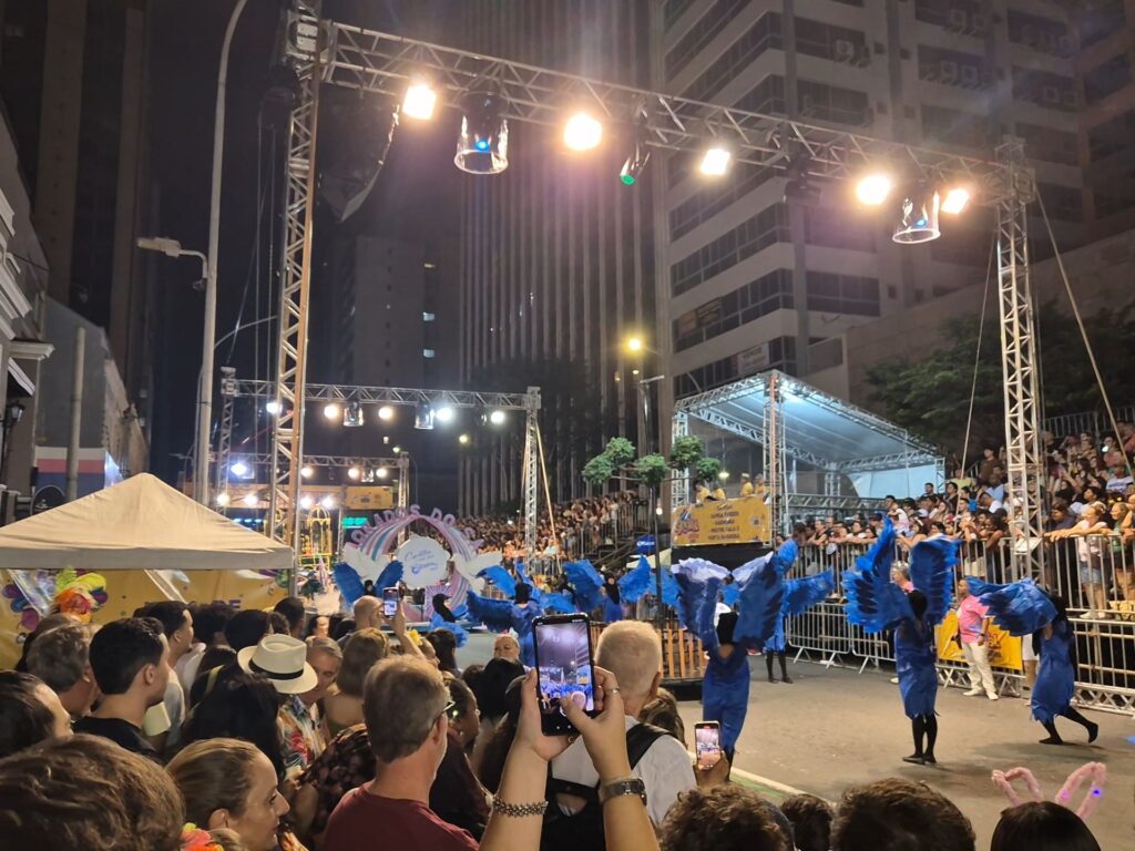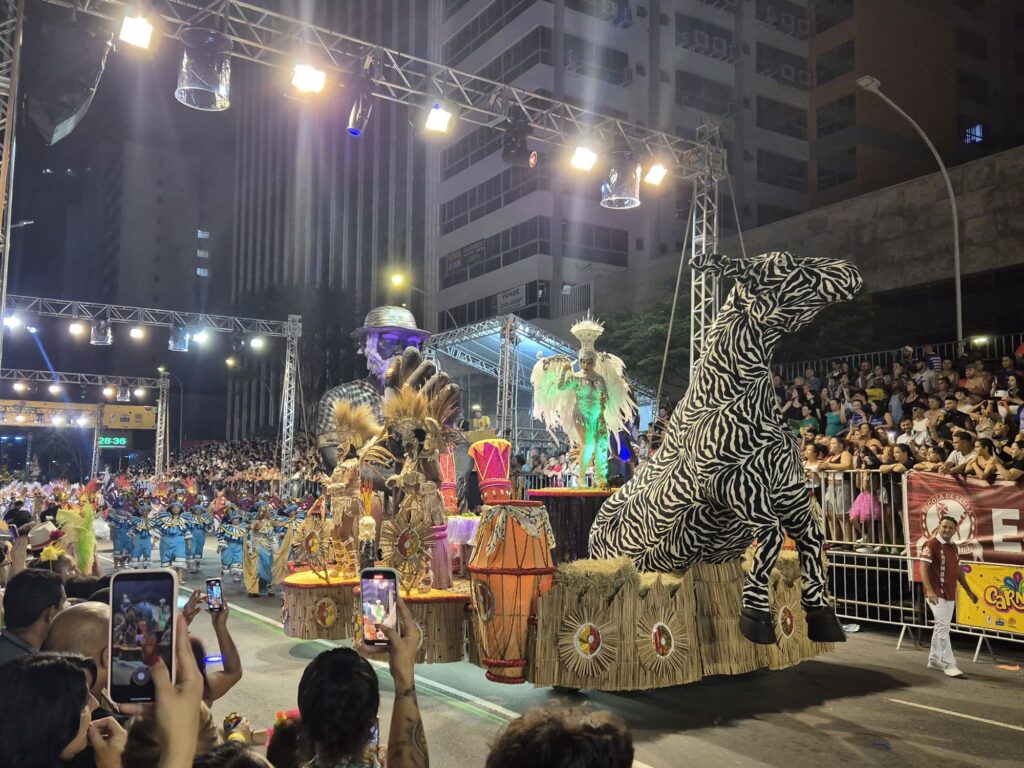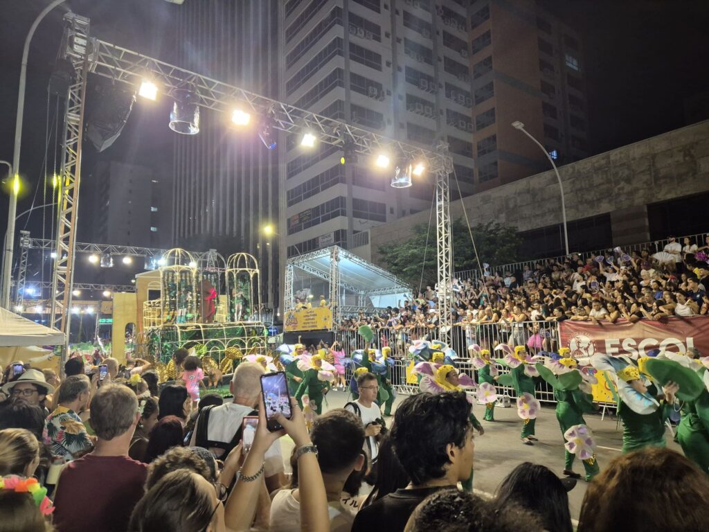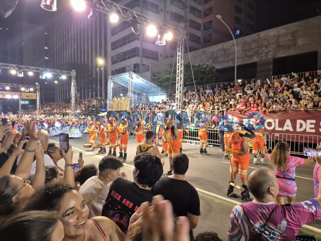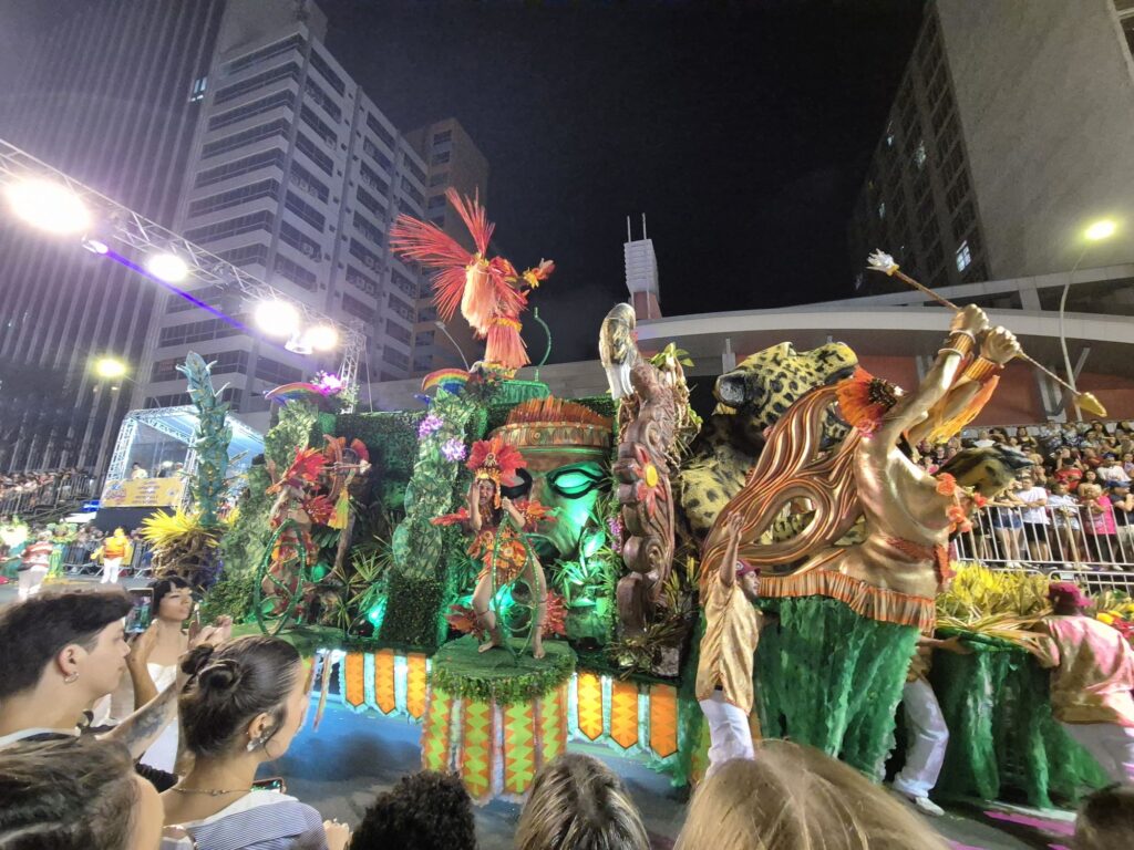 Es gibt immer verschiedene Sambaschulen, die beim Karneval dann jeweils einen Umzug vorführen. Deshalb hatten wir auch die Möglichkeit, mehrere verschiedene Ansätze dafür zu sehen. Eine Sambaschule hat zum Beispiel Nachhaltigkeit und Umweltbewusstsein als Fokus gesetzt. Dort waren dann Tanzende als verschiedene einheimische Tiere aber auch als Recycling-Symbole und Müllmänner/-frauen verkleidet, um darauf aufmerksam zu machen, wie wichtig und einfach Umweltschutz ist. Was alle Sambaschulen gemeinsam hatten, war natürlich der Samba und die gute Laune.