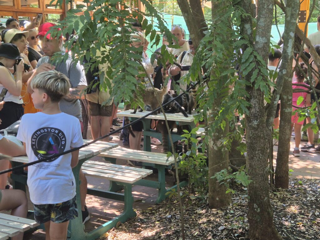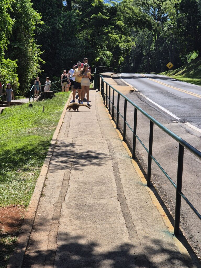 Um ehrlich zu sein, ist es schwer, jetzt noch irgendwas dazu zu sagen. Ich glaube, die Bilder sprechen hier für sich. Wirklich gigantisch! Wir waren dort unterwegs auf Wanderwegen direkt an der Klippe sowie auf Stegen, die näher an die Wasserfälle und mehr über die Mitte des Flusses geführt haben. Das schöne ist ja, dass noch so viel Grün um die Wasserfälle erhalten ist, was zum einen zeigt, wie schützenswert unsere Natur ist (nicht nur dort, wo kilometerbreite Wasserfälle sind) und wofür es sich lohnt, zu kämpfen, aber auch, wie gut Naturschutz kombiniert mit (Öko-)Tourismus funktionieren kann und wie sehr am Ende alle davon proitieren. Denn in dem Stück, das wir noch gelaufen sind vorher, war abgesehen von einem Trampelofad alles naturbelassen. Es lag auch kein Müll rum und man hatte wirklich nicht das Gefühl, dass man sich an einem Touristenhotspot aufhält. Wie gut der Naturschutz funktioniert, sieht man auch an den Tieren, die man dort immernoch sehen kann. Zum Beispiel Nasenbären (Quatis). Die sind überall rumgelaufen und haben vor allem dort, wo Essen verkauft wurde, versucht, das Essen zu klauen.