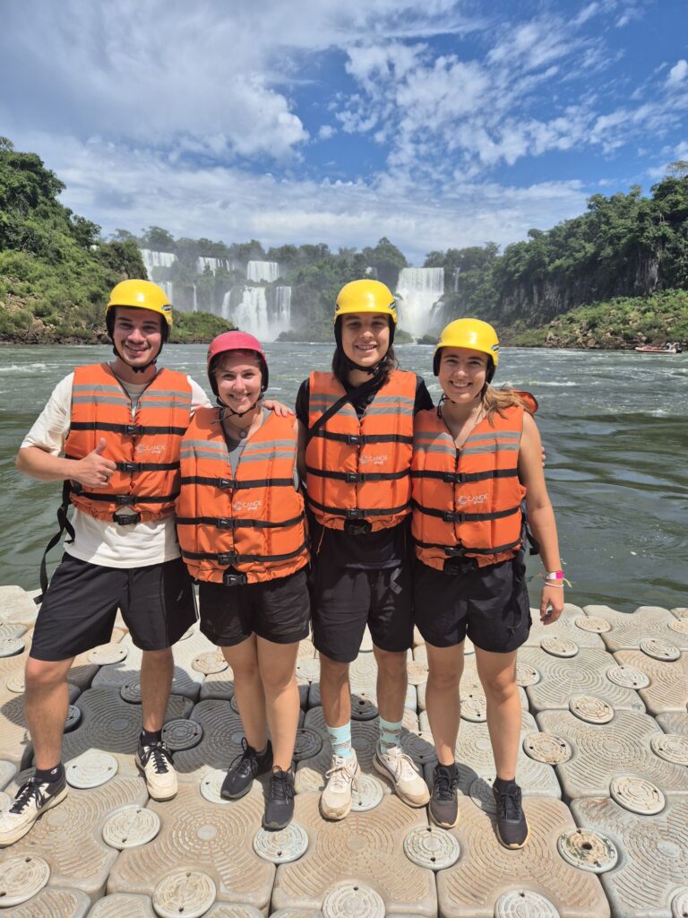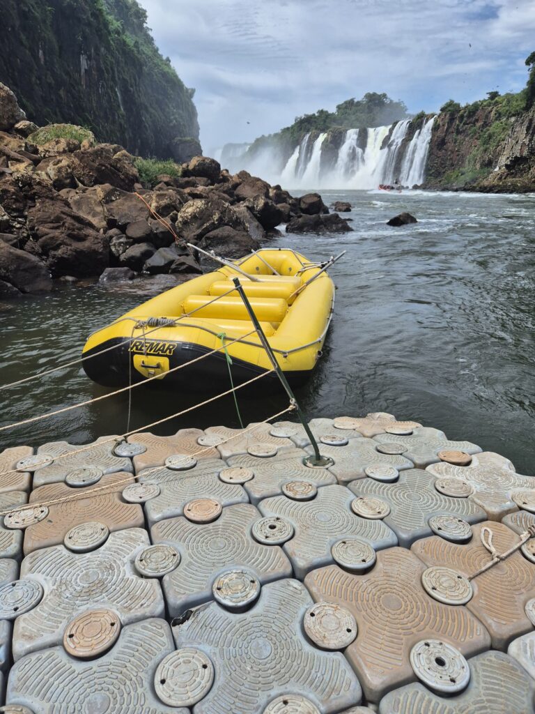 Auch wenn wir das etwas anders und vor allem etwas weniger abenteuerlich erwartet haben, haben wir uns dann drauf eingelassen. Was auch schön war, war dass wir zu viert zwei Guides nur für uns hatten, denn es kam niemand mehr dazu. Was wir auch vorher nicht wussten, war, dass wir selber rudern und steuern mussten, zwar auf Kommando vom Guide, aber aus eigener Kraft. Allerdings ist das auch nur die halbe Wahrheit, denn unser „Kapitän“ hat sich als professioneller Ruderer herausgestellt und hat schon bei Weltmeisterschaften mitgerudert, wir waren also gut aufgehoben. Auf jeden Fall haben wir dann unsere Sachen in einem wasserdichten Sack verstaut und sind nach einer Sicherheitseinweisung losgefahren. Mit dem kleinen aufblasbaren Gummiboot auf dem reißenden Rio Iguazu. Echtes Rafting eben! Und so sind wir mit den Wasserfällen im Rücken losgepaddelt, mit voller Kraft voraus. Mitten durch die Strömungen und alles was Spaß macht.