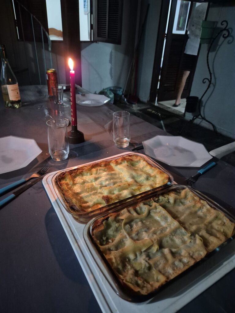 Die Lasagne mit Kürbis hat weniger Probleme gemacht und es hat eigentlich alles funktioniert wie wir es wollten. Wir hatten dann Lasagne mit Bechamelsoße, Spinat, Tomatensoße und Kürbis. Da unser Gasofen zum Glück auch ohne Skala am Regler funktioniert hat, hatten wir dann eine leckere Hauptspeise.